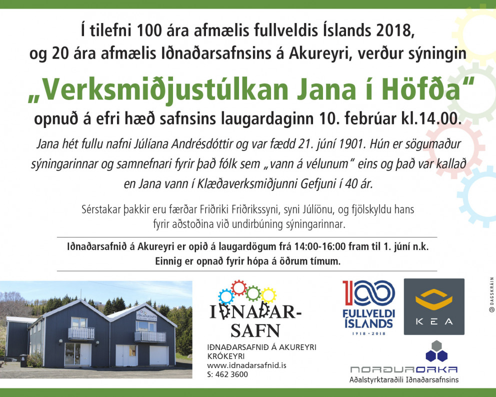 Í tilefni af 100 ára afmælis fullveldis Íslands 2018 og 20 ára afmæli Iðnaðarsafnsins á Akureyri, verður sýningin "Verksmiðjustúlkan Jana í Höfða" opnuð á efri hæð safnsins laugardaginn 10. febrúar kl. 14.00.